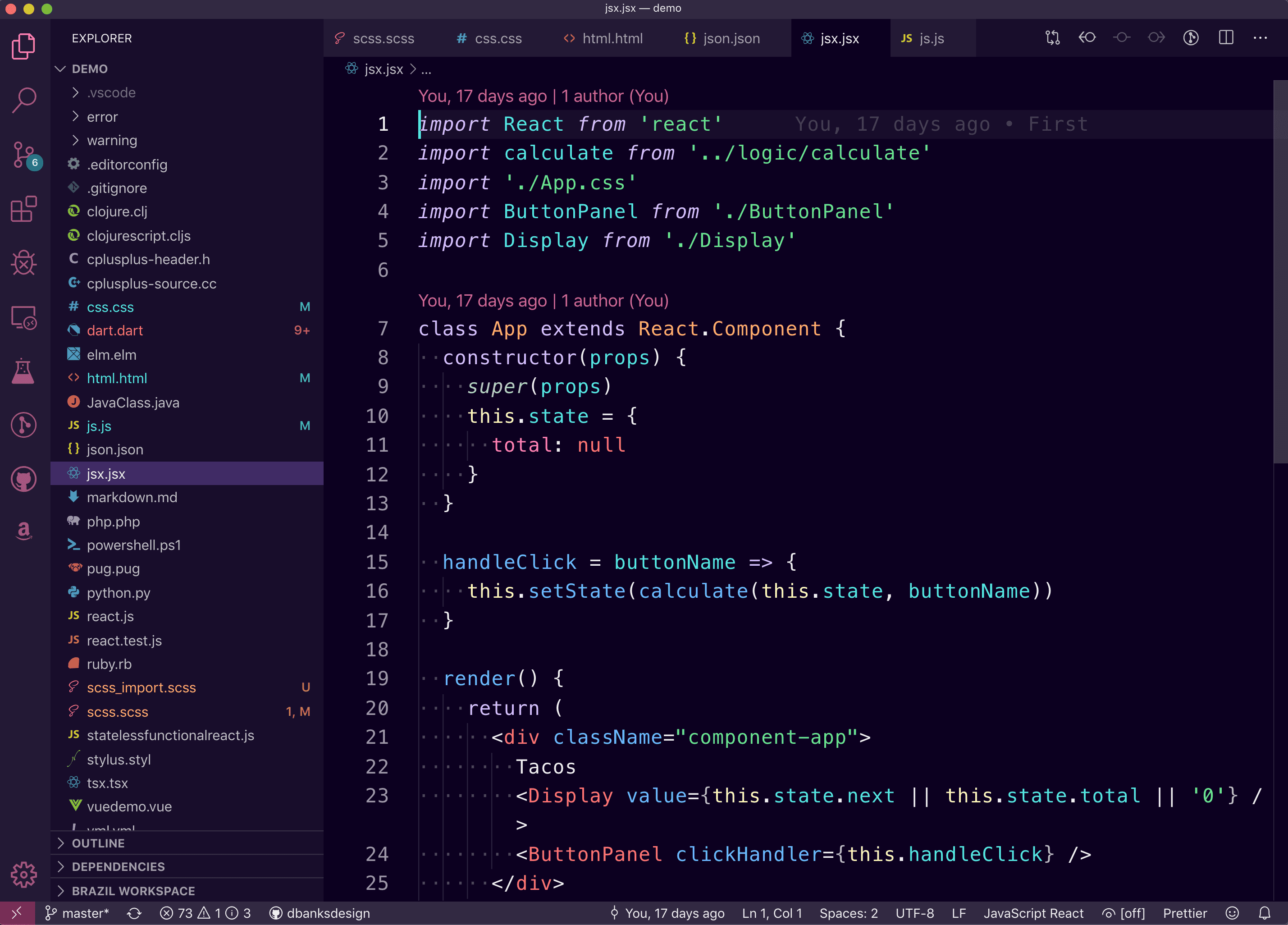 - demo/: files used for testing syntax colors. These files were borrowed from Sarah Drasner’s Night Owl theme (and added to)